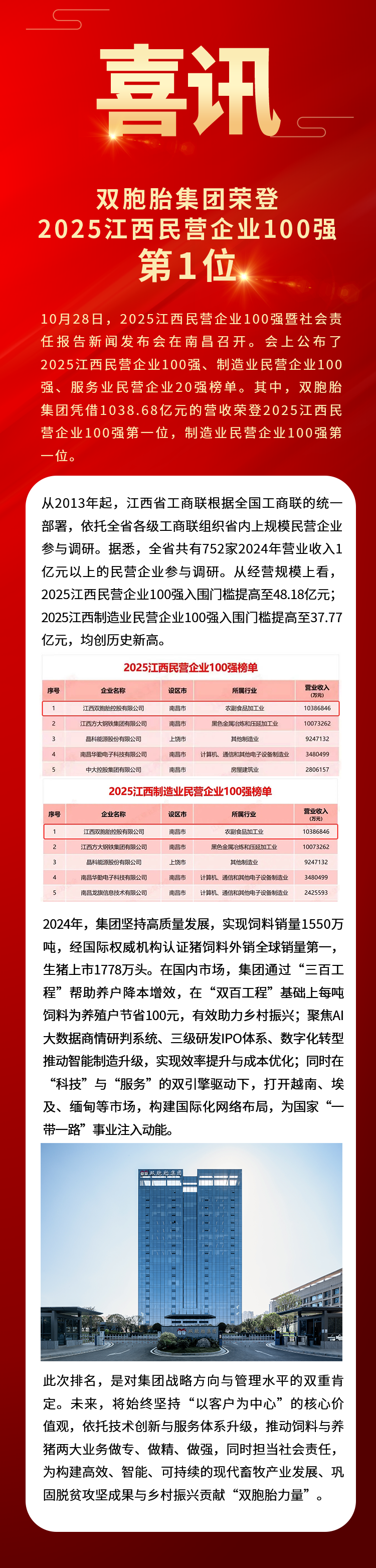 位列第一!双胞胎集团荣登2025江西民营企业100强榜首