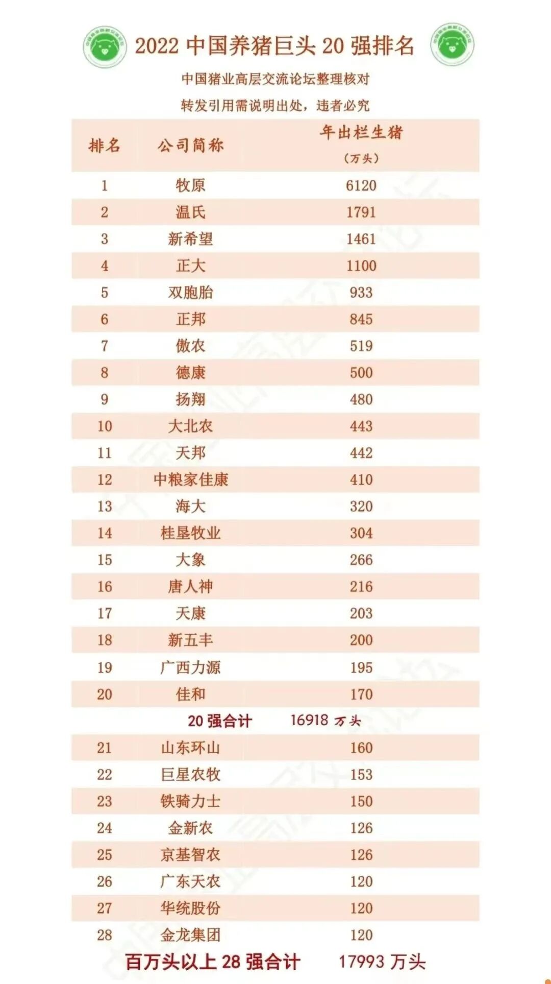 根据中国猪业高层交流论坛统计,2022年养猪巨头20强生猪出栏量16918万头,相比2021年前20强13635万头的出栏量,增加了3283万头。2022年,前20强养猪巨头出栏量占全国总出栏量69995万头的24.17%;2021年,前20强养猪巨头出栏量占全国总出栏量67128的20.31%。一年的时间市场比重即增长了3.86个百分点。
