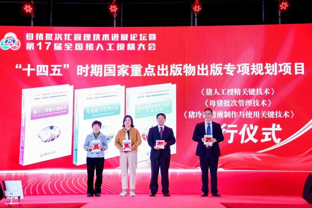 3月5日晚上,大会举办了“第17届全国猪人工授精大会海边沙滩文艺晚会”,在晚会现场,举行了由中国种猪信息网&《猪业科学》超级编辑部总编辑孙德林教授牵头策划的“十四五”国家重点出版专项规划项目——《面向2035:中国生猪产业高质量发展关键技术系列丛书》发行仪式,宁波第二激素厂作为其中《母猪批次管理技术》分册的主编单位,岑总作为主编单位代表登场为丛书发行剪彩。