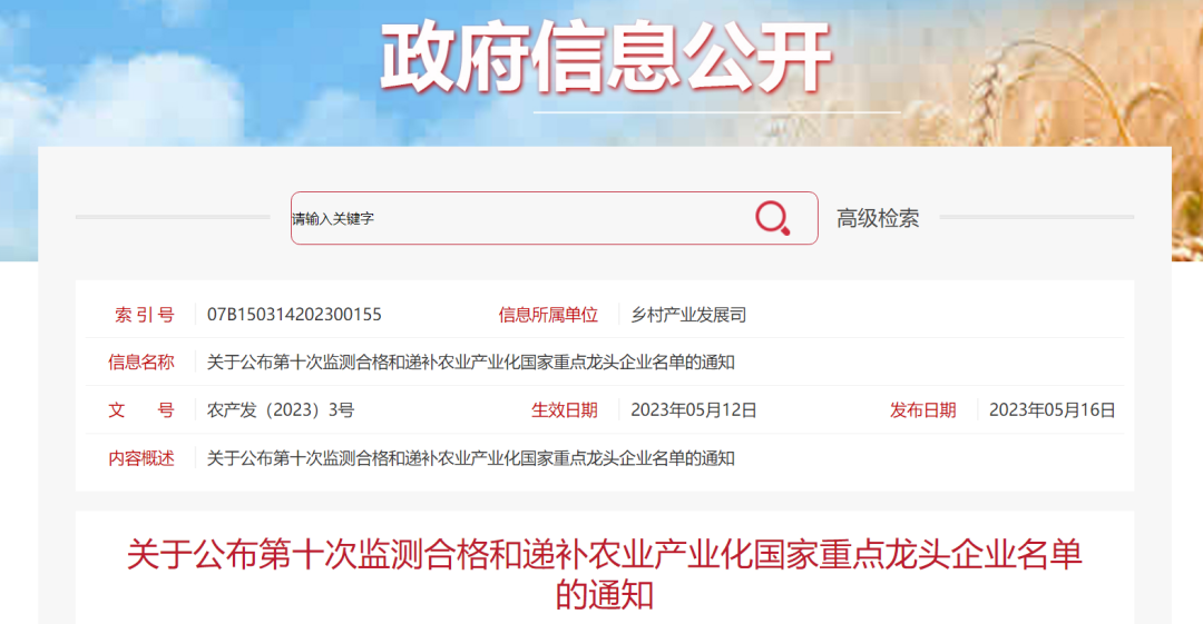 文件指出,希望此次监测合格和递补的农业产业化国家重点龙头企业在全面推进乡村振兴、加快建设农业强国中发挥示范引领作用。