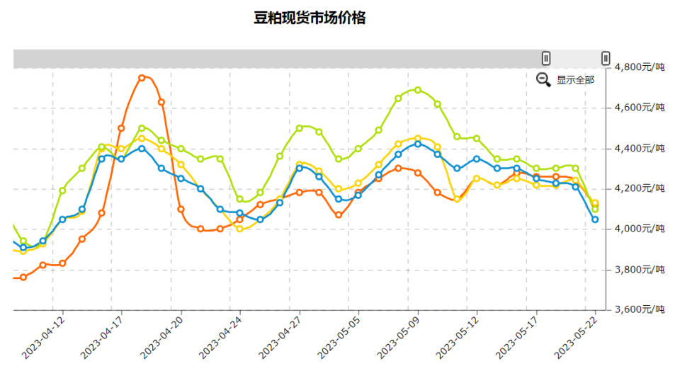5月中旬,国内期货市场上玉米主力合约2307达到2495元/吨的阶段低点,较今年2月2881元/吨高位已回落超13%。而此前,豆粕主力合约2309在4月末达到3362元/吨,较年初每吨近4000元的高位已下降超15%。