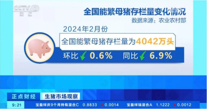 能繁母猪存栏量自2023年1月起已连续14个月环比下降。农业农村部数据显示,截至2月末,全国能繁母猪存栏量已下降至4042万头,环比下降0.61%,同比下降6.9%。比较来看,目前能繁母猪存栏量较2023年年末下降2.47%,业内认为,由于农业农村部将能繁母猪正常保有量目标从4100万头调整为3900万头,预计行业产能去化将持续。