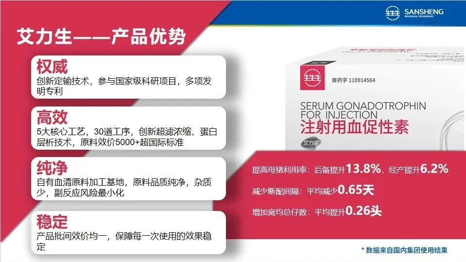 解决母猪无情期问题最直接有效的方法便是通过促卵泡素(FSH)作用激活母猪的卵巢发育,在母猪参配前建立初情期,确保母猪参配时达到最佳受孕状态。猪自源性FSH因代谢时间过短,在生产上无法满足初情期建立的需求,孕马血清的血促性素(PMSG)——艾力生,正好为这一问题提供了理想的解决方案,模拟母猪FSH作用,应用于母猪的情期建立、提高母猪参配率、改善二胎断配率低等场景。