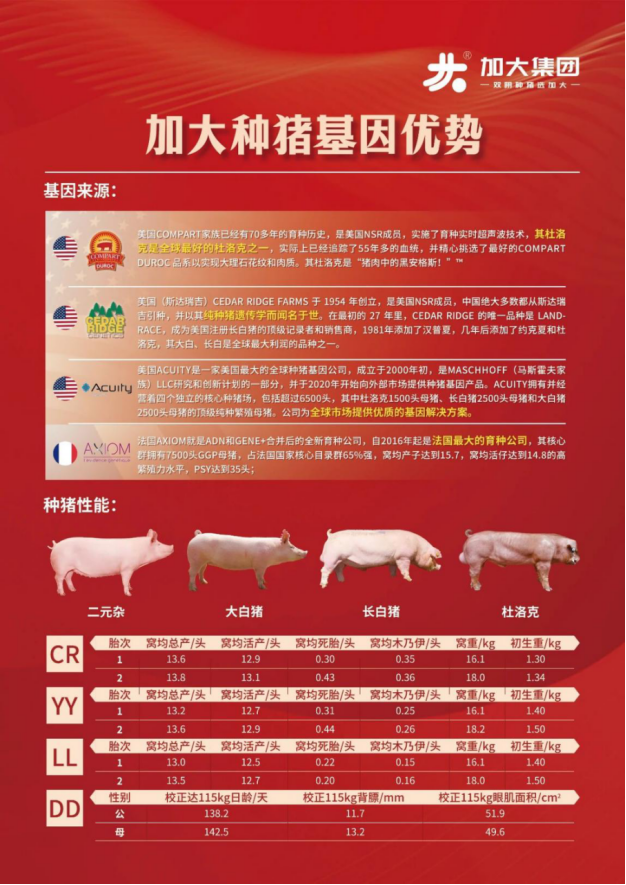 中国养猪网记者了解到,加大种猪是以美国、法国和丹麦种猪为主体。美国种猪的优势是体形好,高长,瘦肉率高,料比低,能养到300斤以上。法国和丹麦种猪的优势是产仔多。两者优势结合在一起,实现效能倍增,更加精准满足中国市场的多元化的高端种猪的需求。另外为顺应新时期养猪行业发展需求,加大推出了“加大有囍种猪”,这款为100%怀孕蓝耳双阴母猪(0胎龄后备母猪),依托全球顶级冠军基因,同时具有高繁殖性能和高生产性能。旨在帮助养猪企业解决种猪基因不纯正、资金回报周期长、复产速度慢等发展痛点。