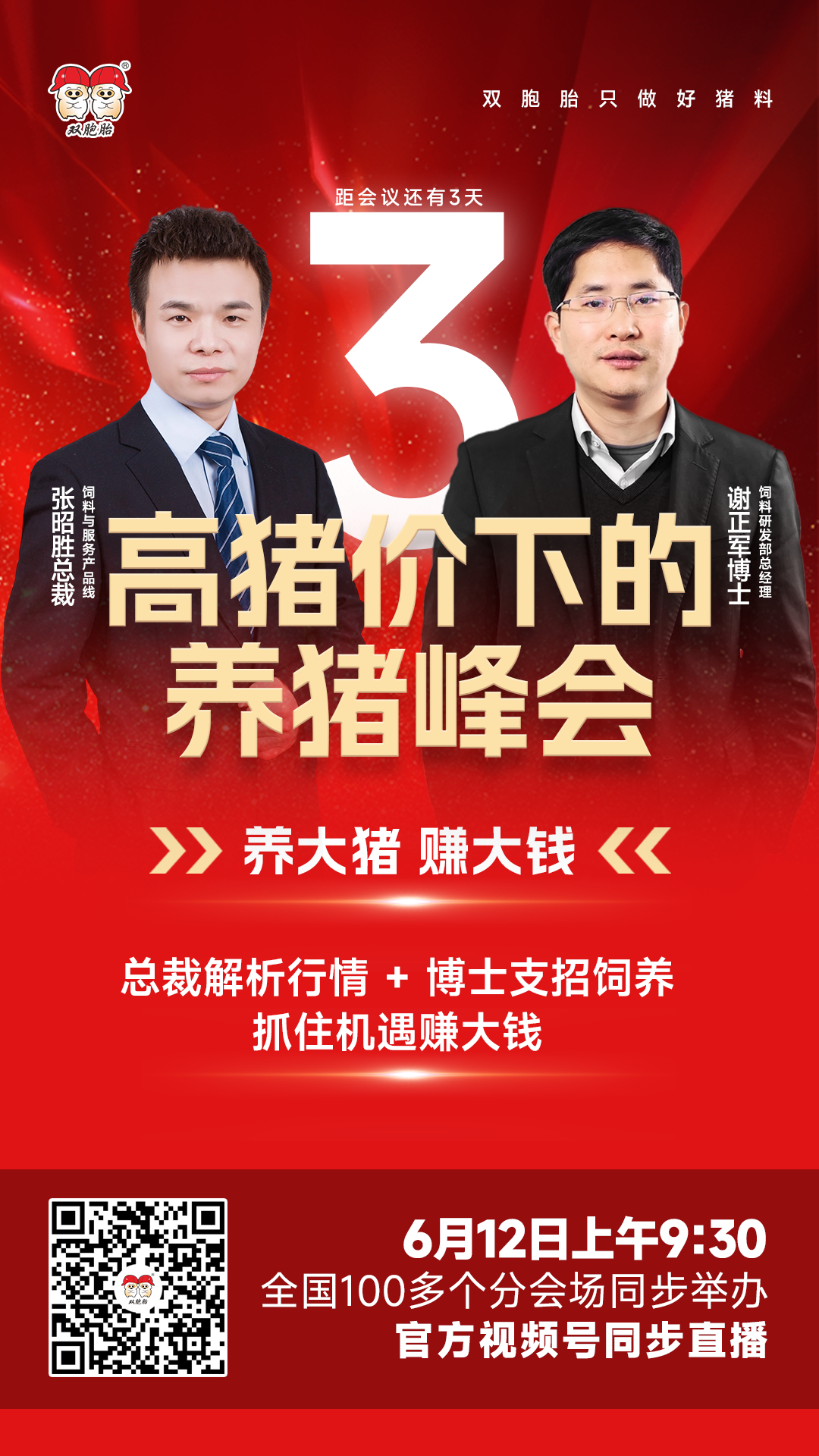双胞胎集团《高猪价下的养猪峰会——养大猪,赚大钱》邀请您的参与!饲料与服务产品线张昭胜总裁亲临现场,帮助养户分析当下行情,抓住机遇,赚取这波养猪的红利!饲料研发部总经理谢正军博士分享饲料技巧,帮助广大养户在好行情下如何养好猪,多赚钱!
