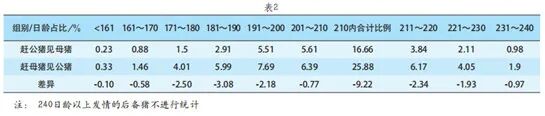 从表1可以看出,赶母猪见公猪的诱情方式,210日龄内发情的比例比赶公猪见母猪的方式高14.68%。