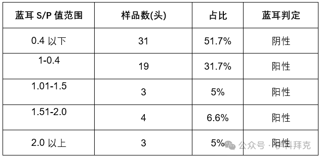 表2. 蓝耳抗体S/P值大小、样品数及判定