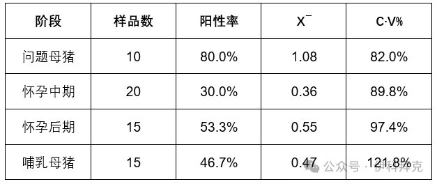 2023年11月份,采集10份临床发病的母猪(流产或咳嗽)、20份怀孕中期母猪、15份怀孕后期母猪和15份哺乳母猪血液检测蓝耳抗原和抗体。