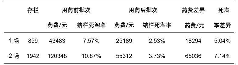 4.3 放养商品猪影响: 他们分别统计了用药前(2023年11月)和用药后(2024年3月)母猪群所产仔猪的药费和死淘情况:其中1场用药前批次,859头仔猪,损失率为7.57%,全程育肥药费达到43483元;2场用药前批次,1942头仔猪,损失为10.87%,全程育肥药费达到120348元。用药后批次,1场的商品猪死淘率降低至2.53%,全程育肥药费下降为25189元;2场商品猪死淘率降低至3.73%,全程育肥药费下降为55312元。如下表3: