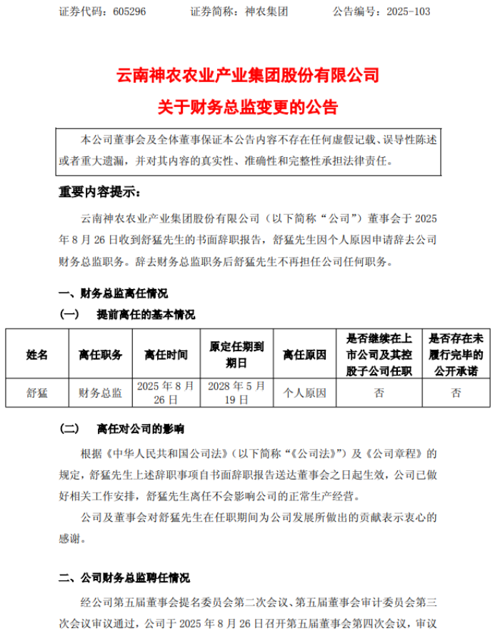8月26日,神农集团发布公告称,舒猛先生因个人原因申请辞去公司财务总监职务。同时,公司于2025年8月26日召开第五届董事会第四次会议,同意聘任闫瑾先生担任公司财务总监。