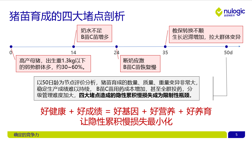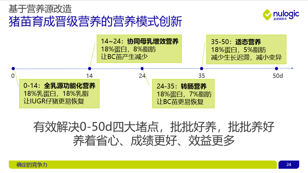 这四大堵点造成的猪苗育成在数量、质量、重量上的隐性累积慢损失,已成为限制行业发展的关键瓶颈。对此,刘博士结合自身实践,提出了针对50日龄之前的四阶段营养晋级精准干预解决方案,包括断奶前0-14d全乳源功能化营养,14~24d协同母乳增效营养;断奶后24~35d转肠营养,35~50d适态营养