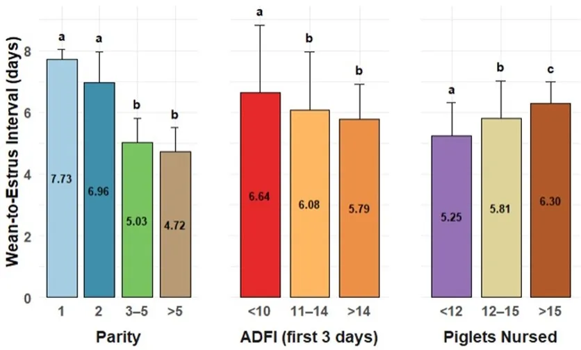与WEI相关的因素主要有三类:胎次、泌乳期前三天的采食量以及母猪的哺乳仔猪数(图1)。季节是一个关键的混杂因素,这一发现提醒我们,气温变化及其他环境波动或许会放大,甚至掩盖管理措施所产生的实际效果。研究显示,哺育仔猪数量超过15头的母猪,其WEI会延长1.3天。同样,泌乳期前三天每日采食量低于10磅(约4.5公斤)的母猪,相比同期日采食量超过10磅(约4.5公斤)的母猪,WEI也会增加1天。泌乳早期,特别是母猪产仔后的最初72小时,采食量不足会阻碍其代谢功能的恢复,损害子宫修复,进而对后续的繁殖性能造成不利影响。因此,确保母猪在这一关键窗口期获得充足的营养摄入至关重要。