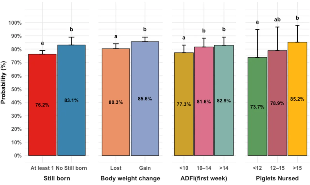 该图展示了死胎、哺乳期前七天平均日采食量、哺乳仔猪和体重变化对后续分娩率的影响。柱状图表示各类别的平均后续分娩率,误差柱状图表示95%置信区间上限。柱状图上方的字母表示各组间存在显著差异(P<0.05)。