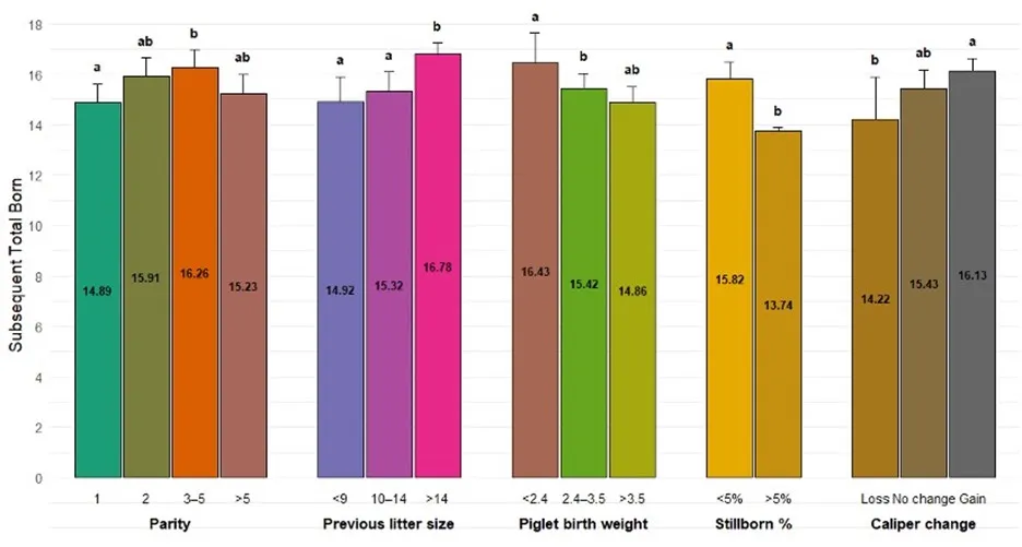 该图呈现了胎次、前一胎产仔数、仔猪出生体重、死胎率及母猪背膘测量值变化对后续产仔数的作用。柱形代表各类别下母猪后续产仔的平均总产仔数,误差线表示 95% 置信区间上限。柱形上方的字母表示组间存在显著差异 (P<0.05)。