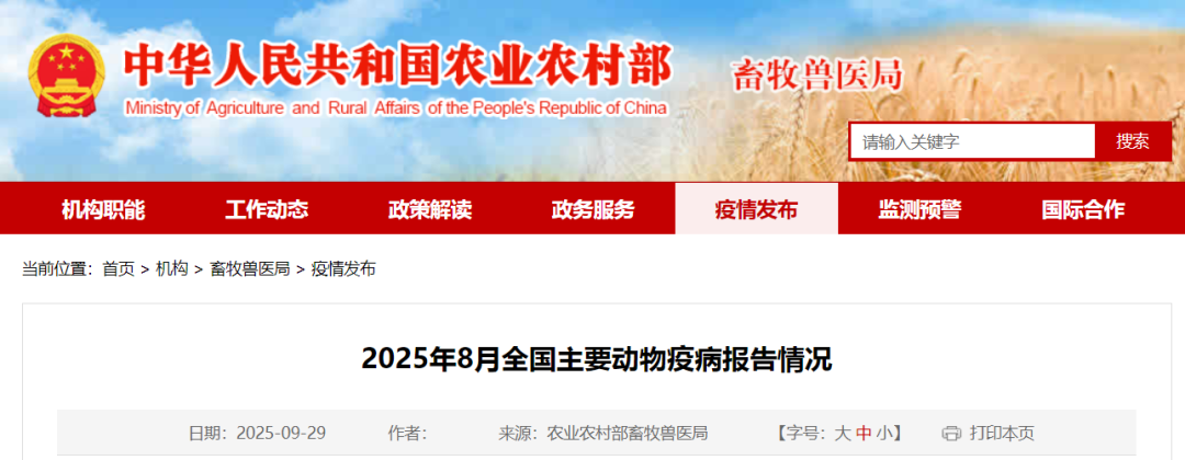 农业农村部通报2025年8月全国主要动物疫病报告情况