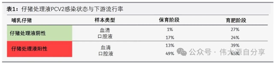 53%的处理液样本检测出PCV2阳性,15个养殖场中有12个(80%)在研究期间至少有1个队列的处理液样本呈PCV2阳性。在保育后期,35%的口腔液样本和8%的混合血清样本检测出PCV2;在育肥后期,55%的口腔液样本和34%的混合血清样本检测出PCV2。综合血清与口腔液样本分析,15个养殖场在保育后期和育肥后期至少1个批次检测出PCV2阳性的猪场分别为12个(80%)和13个(87%)。尽管我们未能证明处理液PCV2的感染状态与下游生产性能存在相关性(因生产性能样本量有限),但发现来自处理液阳性猪群的批次PCV2感染率更高(表1),且处理液PCV2状态(阳性/阴性)与保育猪血清状态(感染率)存在显著关联。当处理液检测阳性时,保育舍中某批次出现一个或多个PCV2阳性混合血清样本的几率高出10倍(95%置信区间1.08-94.8,P=0.04)。此外,我们发现保育舍至少出现一个阳性混合血清样本与育肥舍出现一个阳性混合血清样本之间存在100%的相关性。