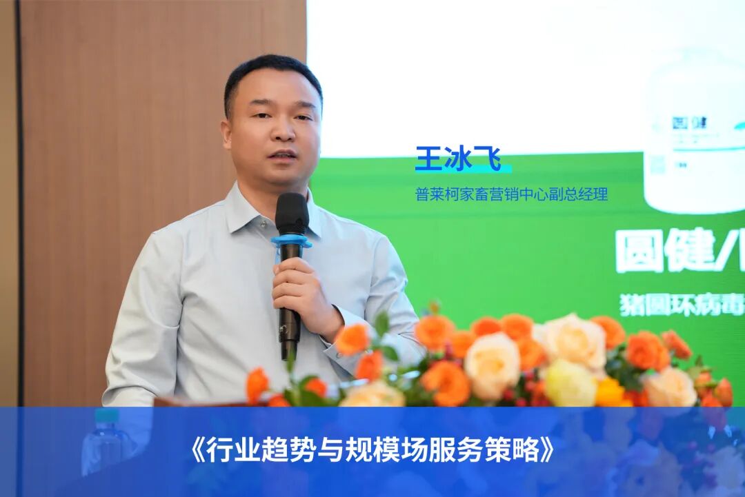 普莱柯家畜营销中心副总经理王冰飞深入剖析了当前生猪养殖行业的现状与核心趋势,并基于对规模化养殖场需求的精准洞察,重点介绍了普莱柯&惠中生物打造的猪用产品综合解决方案及高效的技术服务体系。旨在通过科学、高效的疫病防控与健康管理手段,为猪场稳定生产和效益提升提供有力支撑。