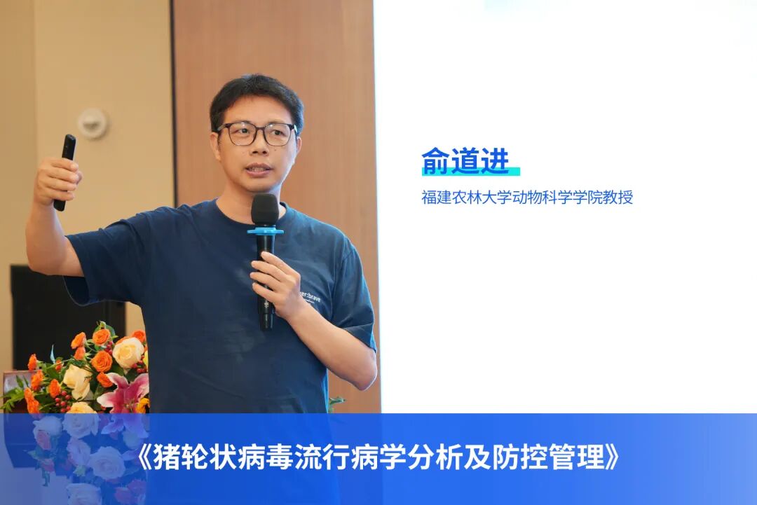 福建农林大学动物科学学院俞道进教授在专题报告中,系统阐述了猪轮状病毒的混合感染与流行多样性、主要感染特征及综合防控方向,并结合发病猪场的生物安全评估与仔猪肠道健康管理的实践案例,为与会代表分享了兼具高度实操性与行业前瞻性的防控见解与管理经验。