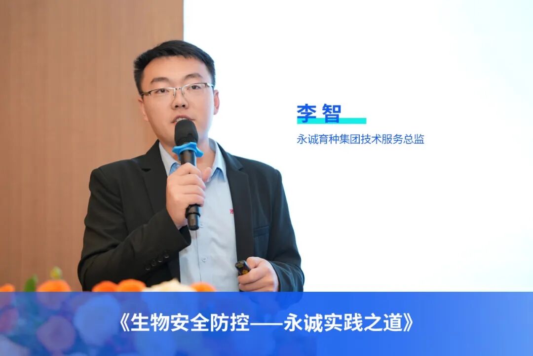 永诚育种集团技术服务总监李智聚焦永诚集团在腹泻疾病的流行与生物安全、关键防疫设施的生物安全设计、永诚生物安全“多级防疫体系”等核心议题分享实战经验。李总强调,生物安全成功与否关键点在于现场管理,需“提认识、守原则、重执行”,筑牢猪场安全防线。