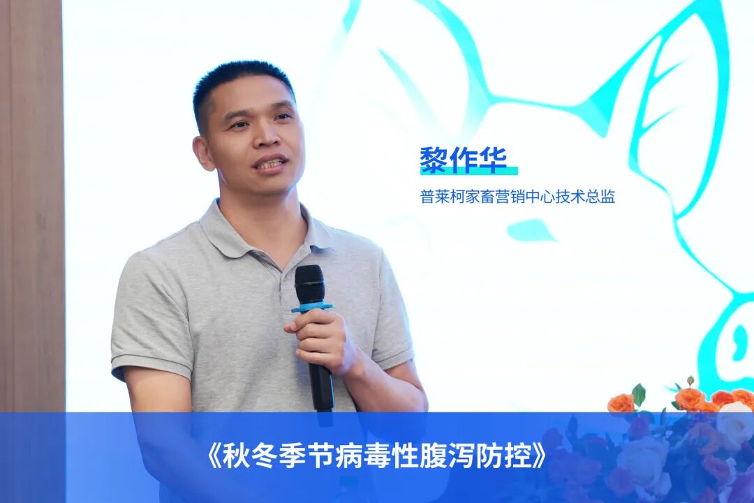 普莱柯家畜营销中心技术总监黎作华博士在《秋冬季节病毒性腹泻防控》专题报告中,系统阐述了当前病毒性腹泻的流行态势、核心防控难点与应对策略。基于对季节性疫病的深入洞察,普莱柯与惠中生物共同推出的腹泻技术服务项目,涵盖风险评估、现场技术服务及抗体检测等关键环节,为养殖场提供了从监测到干预的一体化解决方案,有力助推猪场实现生产稳定与效益增长。