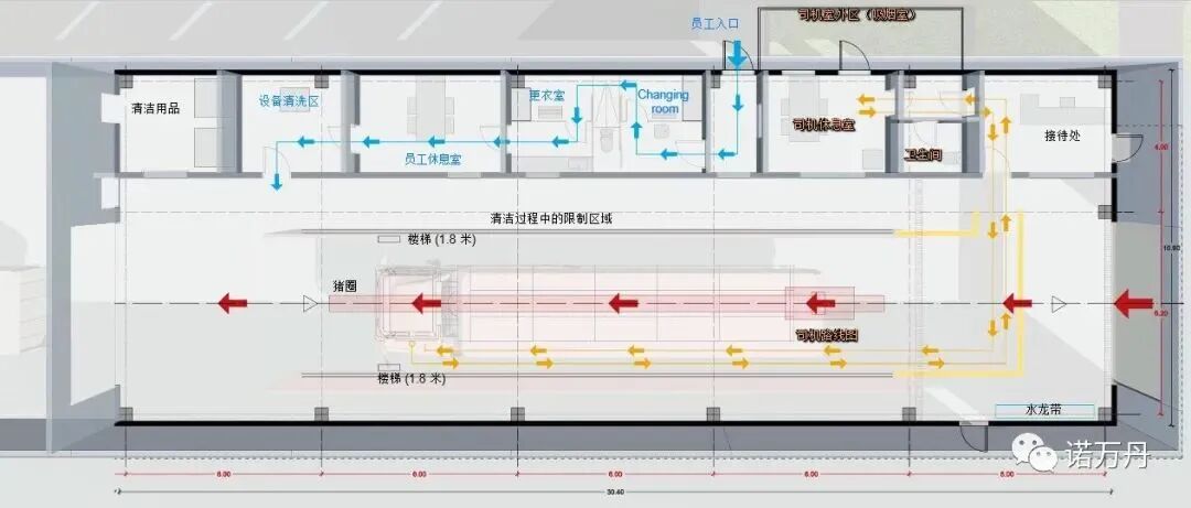 如果检查合格,卡车将通过消毒区,并对车底消毒,之后可进入净区。如果检查不合格,卡车必须返回清洗区进行相应的处理。
