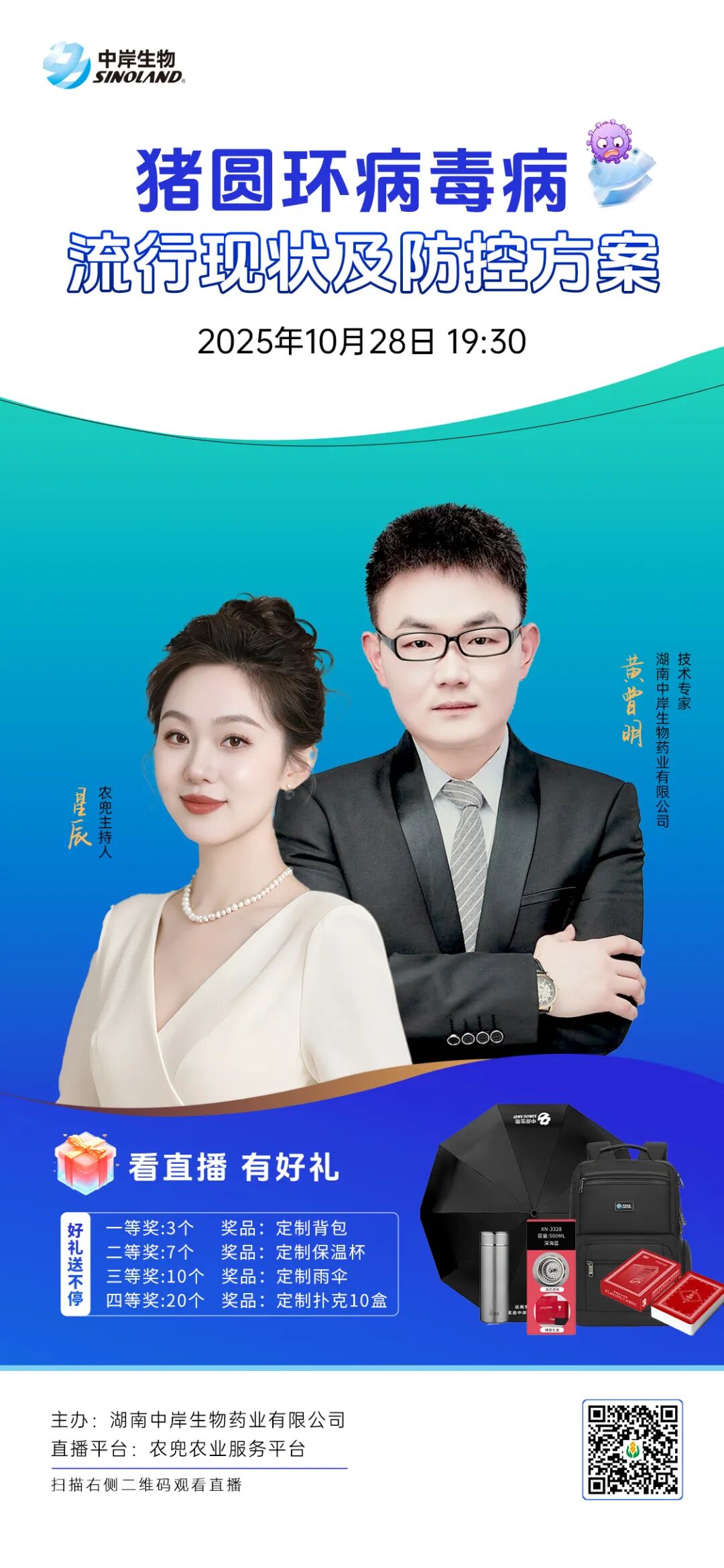 中岸生物邀请您关注{圆环病毒防控}看直播 抽好礼{礼物}10月28日19:30,黄曾明老师分享圆环流行现状与防控方案!