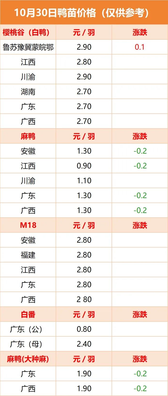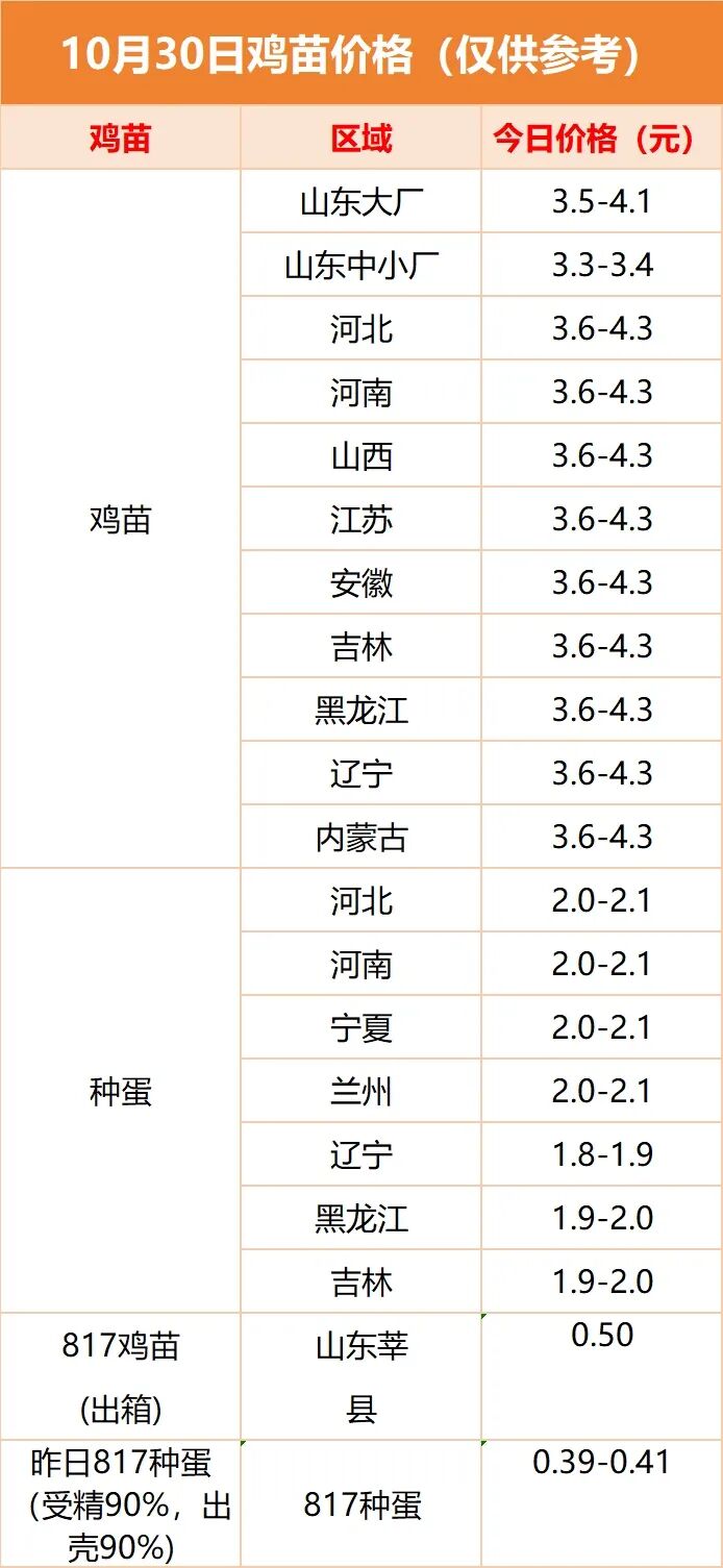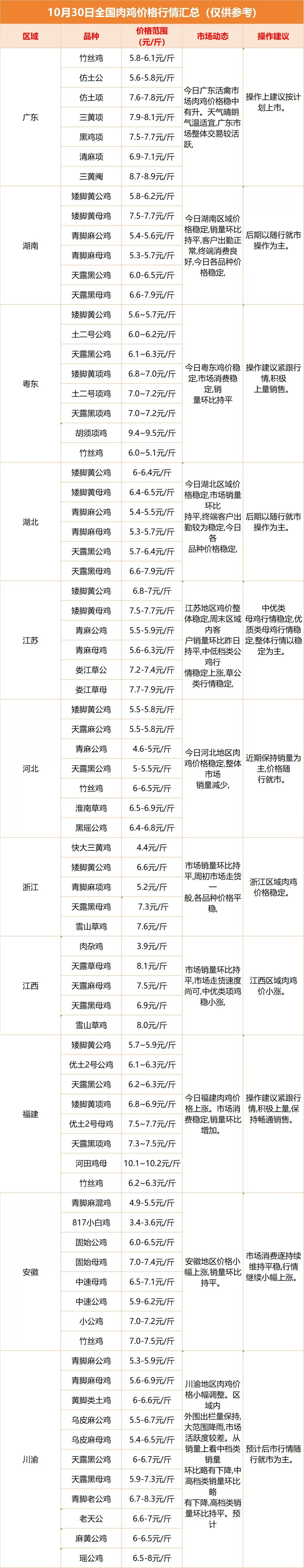 今日全国肉鸡、鸡苗、鸭苗价格(10月30日)