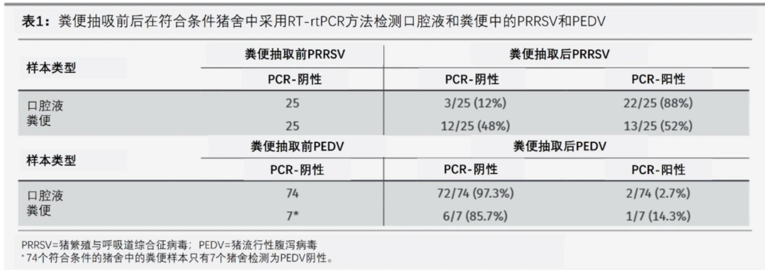 一项前瞻性纵向研究调查了W2F猪群在粪便抽取前后PRRSV RNA和PEDV RNA的检出频率。选取84个猪舍在粪便抽取前及抽取后两周采集口腔液和粪坑样本。