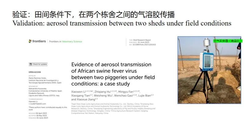田间试验中,通过荧光粉验证灰尘可从一栋舍传播至另一栋舍,证实气溶胶传播存在。