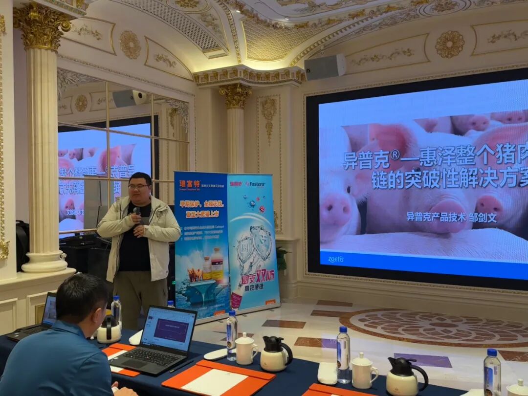 硕腾(中国)高级技术服务主任侯成才老师围绕“猪呼吸道疾病的防控措施”及“猪场蓝耳病防控关键点”展开系统讲解,深入剖析呼吸道疾病发病机理与综合防控策略。硕腾猪业务团队产品技术专员邹剑文老师则就“异普克”的应用优势与实践效果进行介绍,为从业者带来了一套惠泽整个猪肉产业链的突破性解决方案。