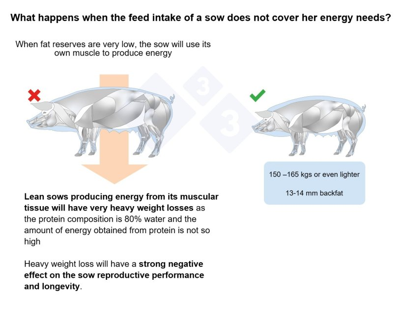 解决方案是:在后备母猪从生长到初次配种期间,控制日粮的蛋白质水平,同时保持其正常的采食量。这样,在满足蛋白质需求后,多余的能量便会转而用于脂肪沉积,从而在控制总体重的同时,增加宝贵的能量储备——背膘。