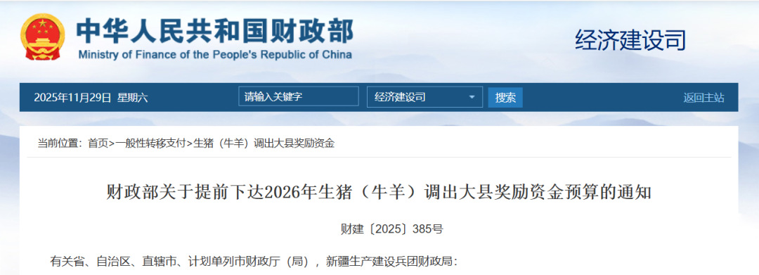 养猪大区前三竟是他们!财政部提前下达2026年生猪(牛羊)调出大县奖励资金预算