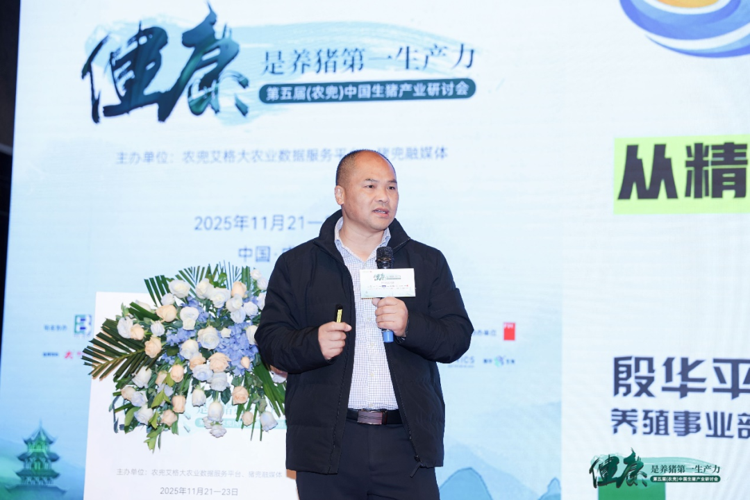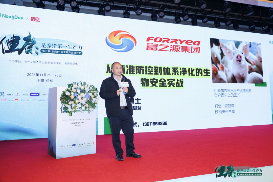 聚焦“健康是养猪第一生产力”这一行业共识,第五届(农兜)中国生猪产业研讨会于11月在蓉城隆重召开。大会围绕“战略升维、价值解码、生态共赢”展开深入研讨,在此背景下,贵州富之源集团(以下简称:“富之源”)养殖事业部副总裁殷华平博士应邀作了题为《从精准防控到体系净化的生物安全实战》的专题分享,系统介绍了富之源在生猪养殖生物安全体系建设方面的落地经验。殷华平强调,生物安全不仅是理论,更是一套必须细化、可执行、能监督的体系工程,他的分享为行业提供了从“知道”到“做到”的可行路径。