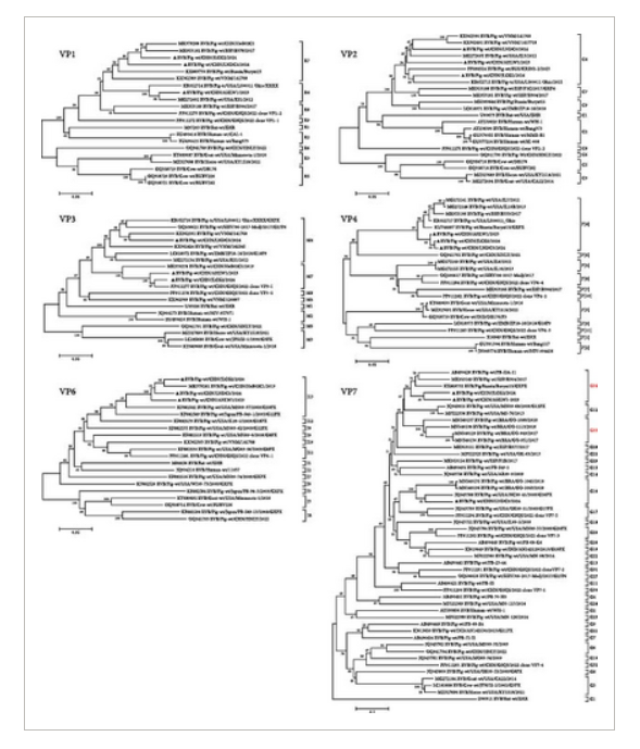 更值得注意的是,这三株病毒彼此之间的基因型也不完全相同。例如,安徽毒株的基因型为G34-P[4]-I13-R4-C4-M7-A8-N10-T4-E4-H7,它与吉林毒株相差1个基因型(R7),与辽宁毒株则相差3个基因型(G16, R7, M4)。分析还发现,与这些毒株各基因片段最相似的参考毒株,来源地遍布中国、美国、越南、俄罗斯、日本等多个国家。这强烈提示,这些致病的PoRVB毒株,很可能是在不同地区毒株之间发生基因重配(即“混合交换”基因片段)后产生的。