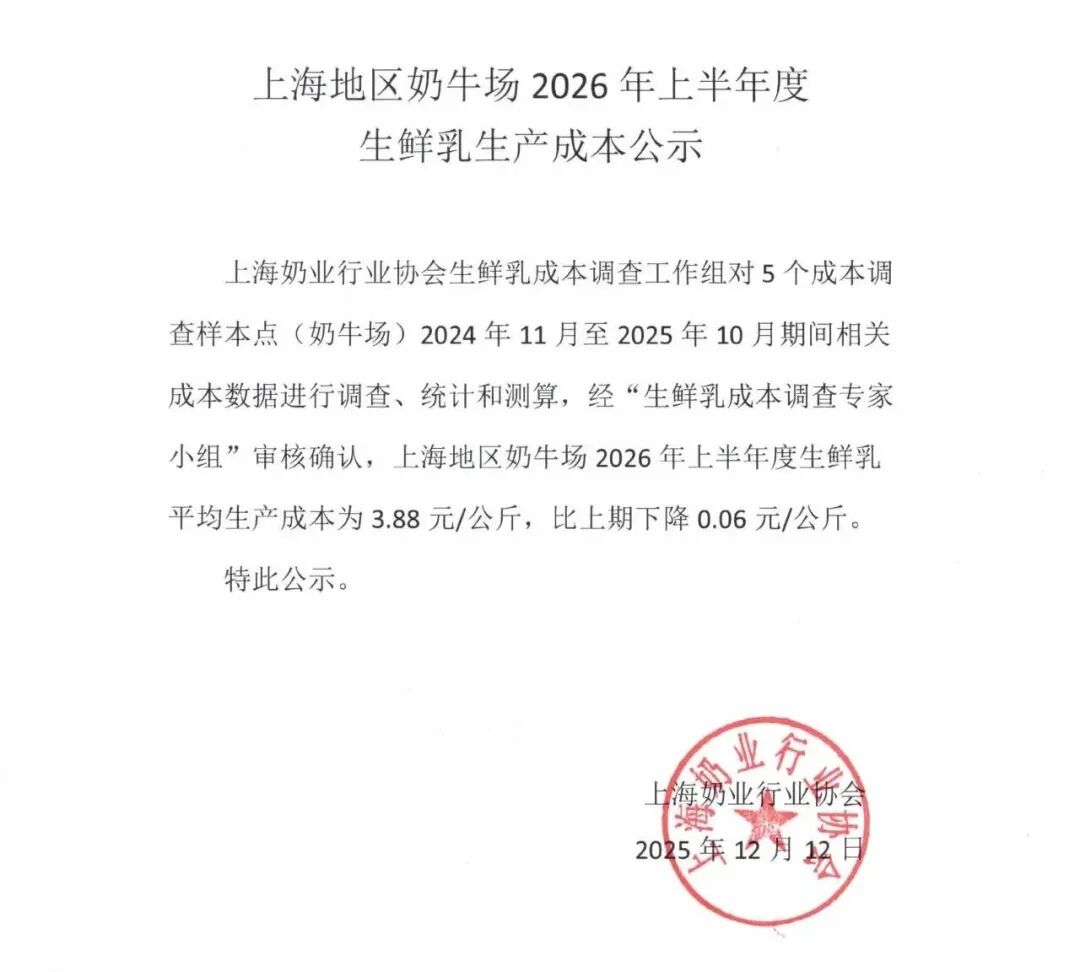 上海奶业行业协会生鲜乳成本调查工作组对5个成本调查样本点(奶牛场)2024年11月至2025年10月期间相关成本数据进行调查、统计和测算,经“生鲜乳成本调查专家小组”审核确认,上海地区奶牛场2026年上半年度生鲜乳平均生产成本为3.88元/公斤,比上期下降0.06元/公斤。