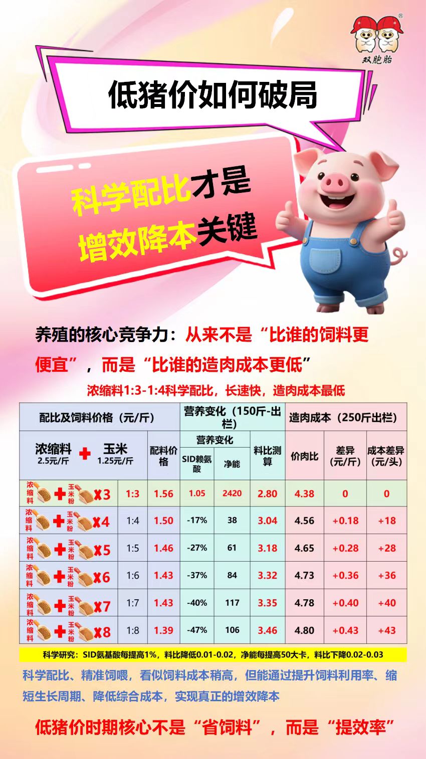 低猪价行情是对养殖模式的考验,也是转变养殖思维的契机。那些看似“省钱”的随意配料方式,实则是用短期利益换取长期亏损。而科学配比、精准饲喂,看似前期饲料成本稍高,却能通过提升饲料利用率、缩短生长周期、降低综合成本,实现真正的增效降本。