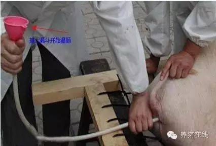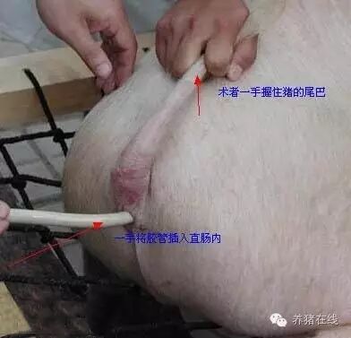 3.溶液注入后由于排泄反射,溶液易被排出,为防止排出,用手压迫尾根,或于注入溶液的同时以手指刺激肛门周围,也可按摩腹部,最好办法是用塞肠器压定肛门。(资料来源:养猪在线)