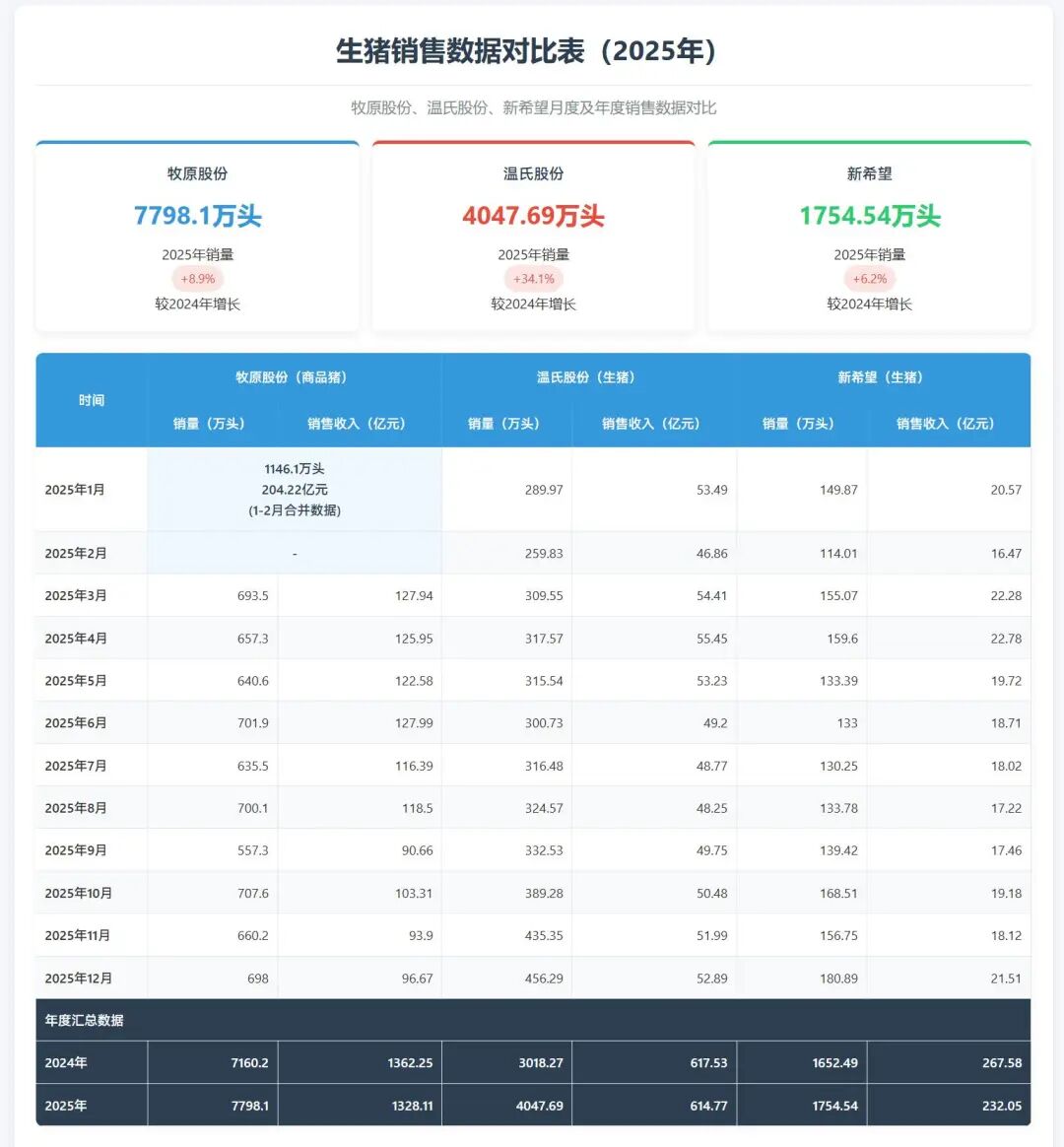 岁末年初,又到了各家生猪养殖企业“晒”出年度经营答卷的时候。近日,多家上市猪企陆续发布了2025年12月及全年的生猪销售数据。这份汇集了销量、收入与价格变动的成绩单,如同一面多棱镜,不仅映照出不同企业在过去一年里的经营轨迹,也折射出当前生猪行业面临的共同挑战与分化态势。对于广大养猪业同仁而言,这些数据背后,是市场供需的冷暖、是成本压力的脉搏,更是未来决策的重要参考。