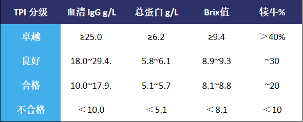 近几十年来,奶牛犊的死亡率大幅降低。然而,发病率依然很高,与之相关仍存在各种问题损害犊牛健康。过去30年,初乳IgG含量的阈值为10克/升,因此,建议根据新的TPI分级进行调整2,13,旨在进一步降低现代奶牛场的犊牛发病率,实现更高的目标。
