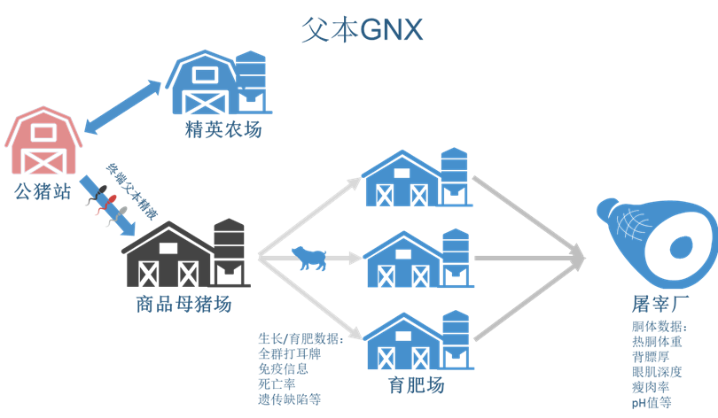● GNX项目的创新:通过将精英农场的精英公猪精液投入到商品母猪场进行单父本配种,并系统收集其后代在商品场环境下的生产数据,让商品场的真实表现成为评判种猪遗传价值的重要标准。