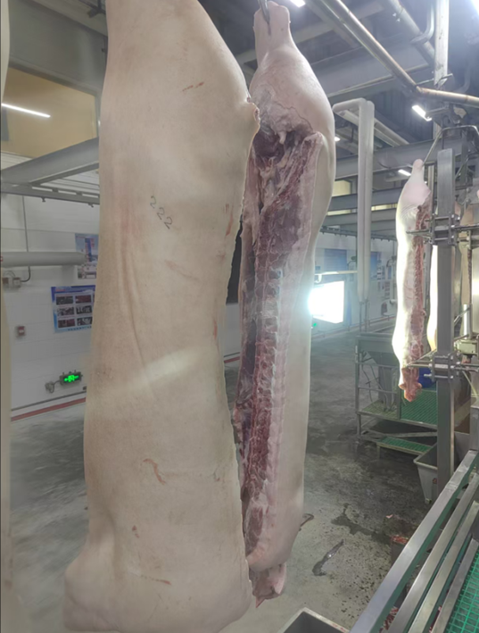 ● 胴体数据收集:猪只达到130kg目标体重后送往合作的屠宰厂收集胴体数据:热胴体重、背膘厚、瘦肉率、眼肌深度、pH等。