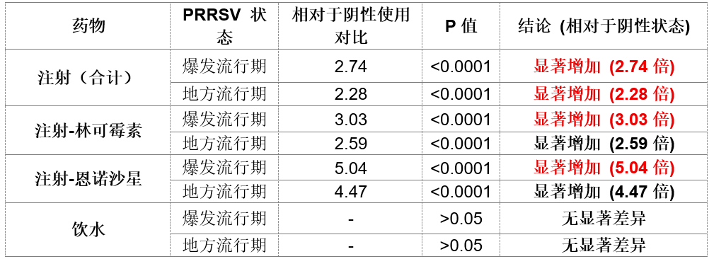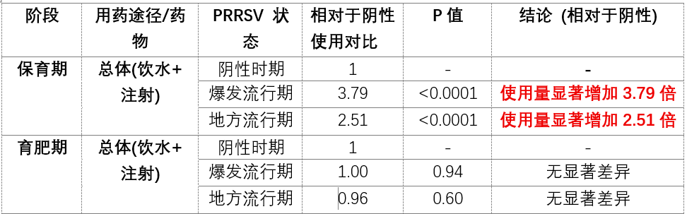 表2.保育阶段不同PRRSV状态下注射抗生素使用变化对比