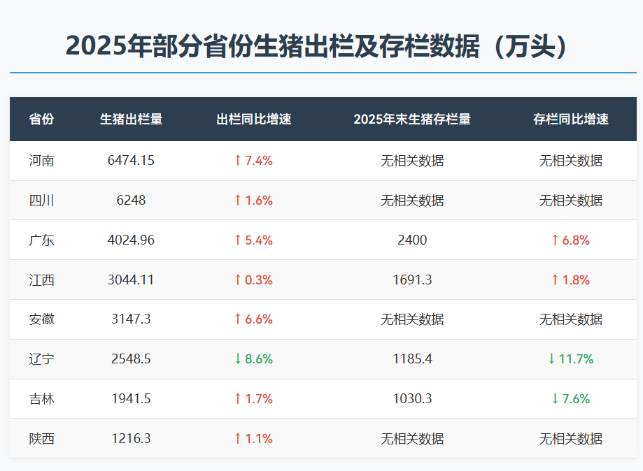 广东省作为猪肉消费大省,2025年生猪出栏量约为4025万头,同比增长5.4%,市场供应保障能力进一步增强。其生猪存栏特别是能繁母猪存栏的细微变化,值得华南地区的同行密切关注。安徽省2025年表现突出,生猪出栏量约为3147万头,实现6.6%的较高增速,猪肉产量同步增长,畜牧业整体呈现积极发展态势。江西省2025年生猪出栏量约为3044万头,同比增长0.3%,增幅虽小,但结合其粮食产量的稳定支撑,生产基础依然牢固。