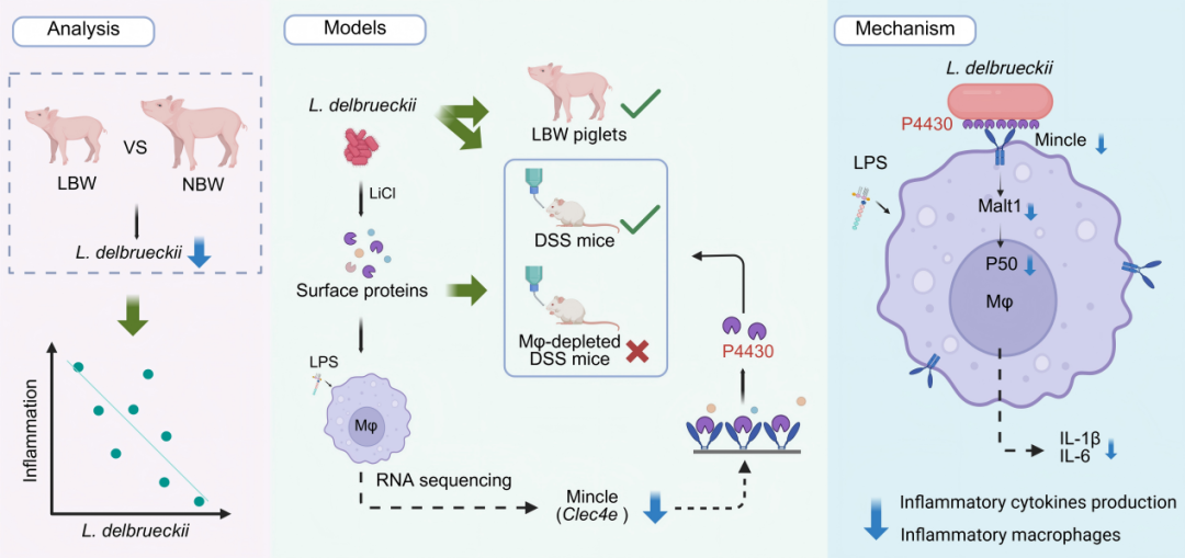 进一步实验表明,补充德氏乳杆菌能够减轻仔猪和实验小鼠的肠道炎症,提升生长性能。更重要的是,研究人员锁定了一种位于该菌表面的蛋白质P4430,证实它是发挥抗炎作用的关键物质。