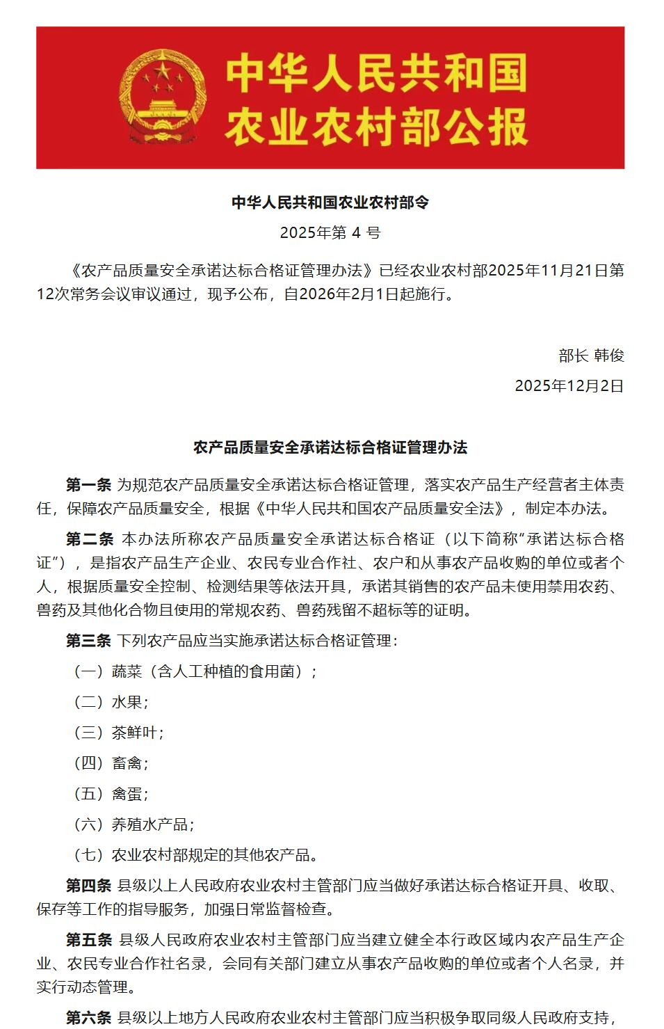 这张合格证,不再是一张可选项,而是随着每一头猪、每一车猪流通的法定标配。它就像猪的“旅行护照”,没有它,旅程可能无法开始。据农业农村部令,这项《农产品质量安全承诺达标合格证管理办法》已于2025年11月审议通过,于今日正式生效。