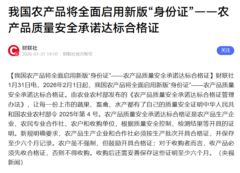 今天,2026年2月1日,对于全国所有的养猪场和养猪户来说,是一个需要特别关注的日子。从今天起,一项新的国家规定正式开始实施,它悄无声息却又深刻地改变着生猪上市的规则。无论您是把猪卖给附近的收购点,还是交给大型屠宰企业,这批猪都必须带着一张全新的“身份证”——农产品质量安全承诺达标合格证。