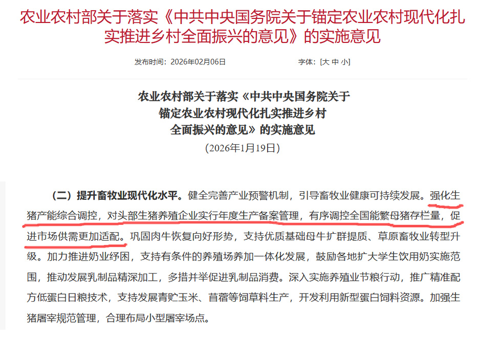 最近,农业农村部的一份文件引发了行业内的广泛关注。文件中明确提到,要“强化生猪产能综合调控,对头部生猪养殖企业实行年度生产备案管理,有序调控全国能繁母猪存栏量,促进市场供需更加适配”。