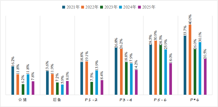 • 母猪:整体随胎次增加阳性率升高,5胎及以上母猪感染比例最高,后备母猪阳性率2025年较前两年上升。