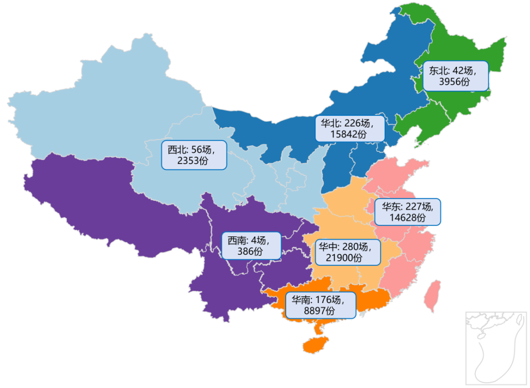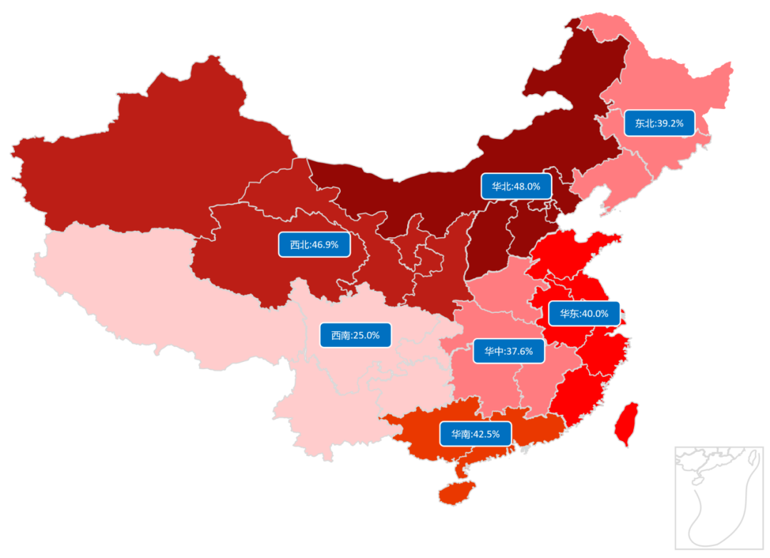 华北地区场阳性率最高(48%),西北(46.9%)、华南(42.5%)、华东(40.0%)次之,均超过40%;东北、西南地区较低。