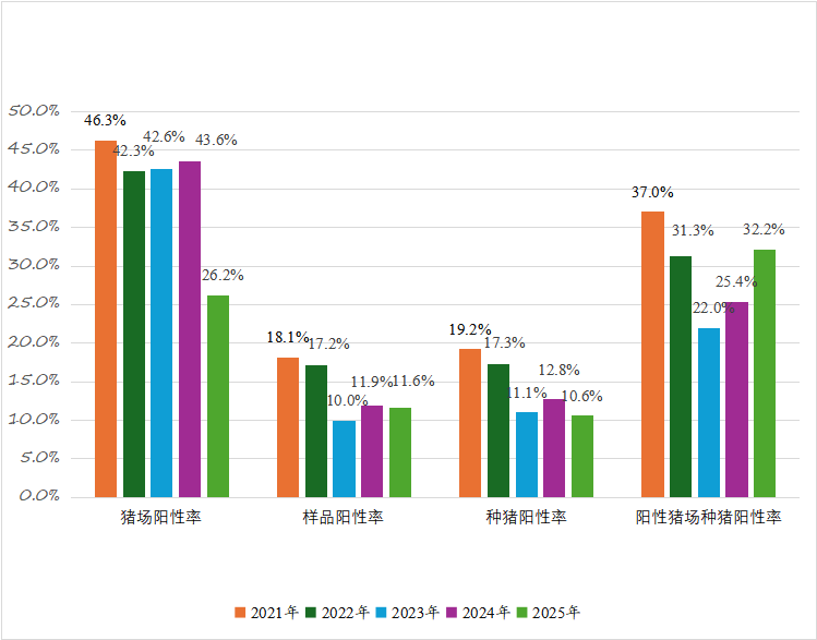 • 种猪阳性率:整体下降,但阳性场中种猪阳性率上升(2025年达32.2%),提示阳性场病毒仍活跃。